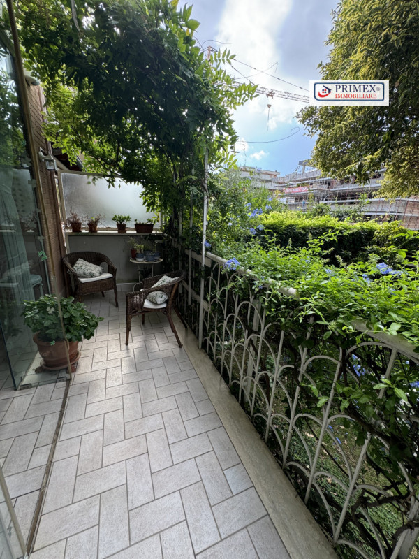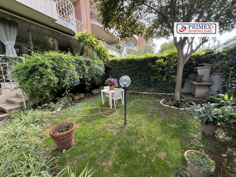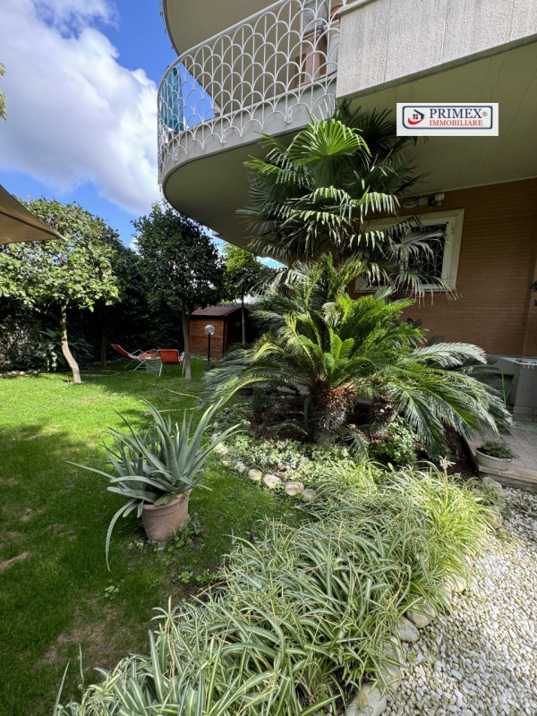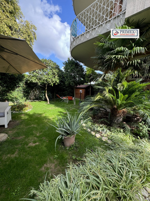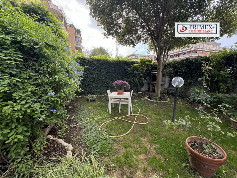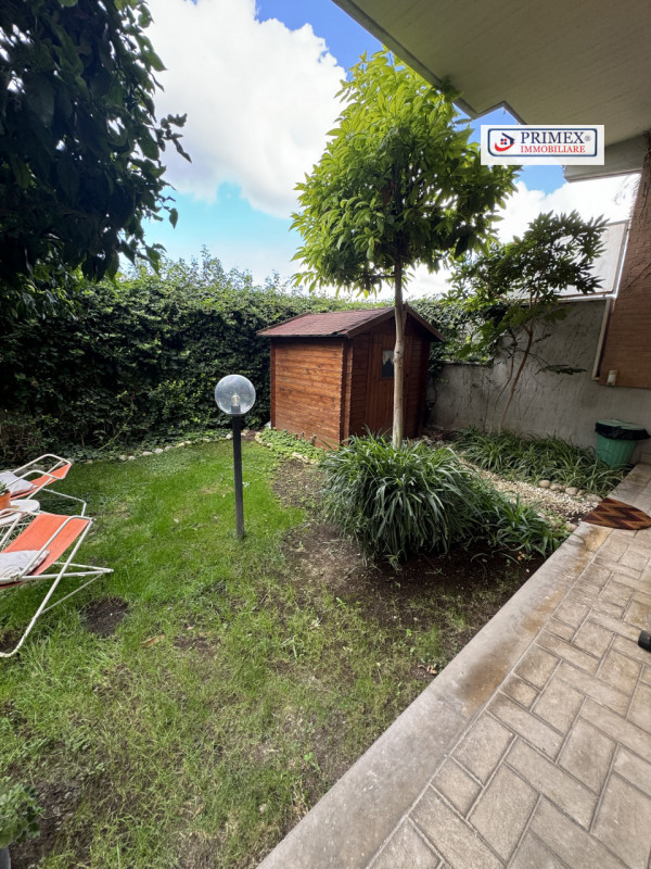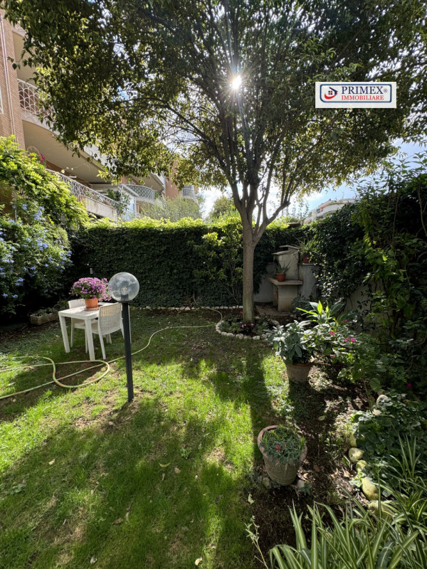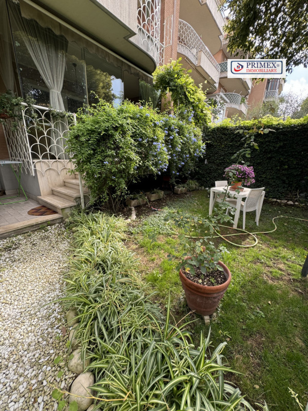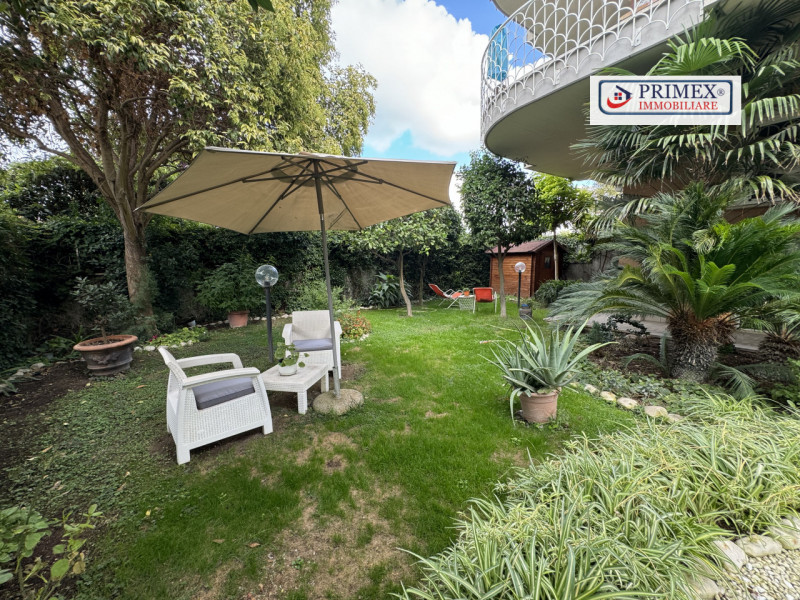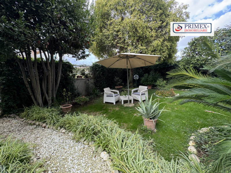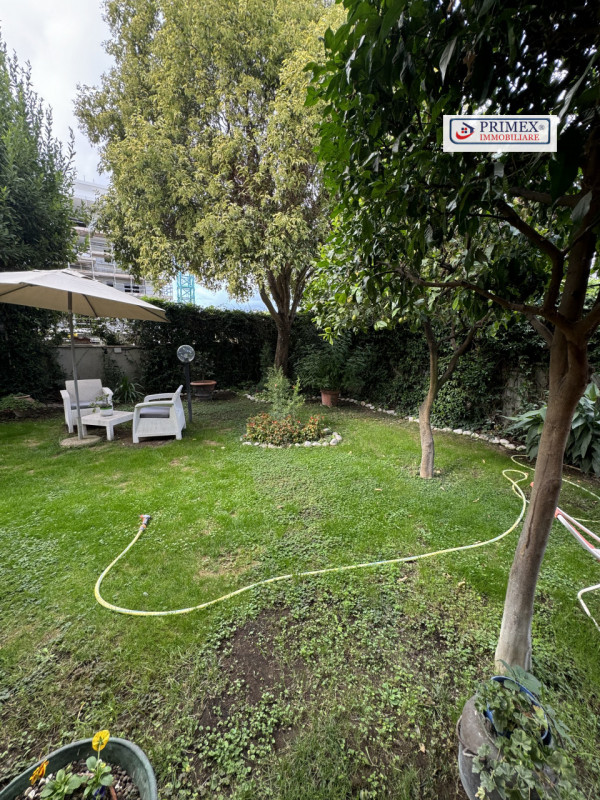 Giardino privato angolare con ingresso autonomo, ricco di piante da frutto e ornamentali, che funge da perfetto spazio verde per momenti di relax e per intrattenere gli ospiti.
